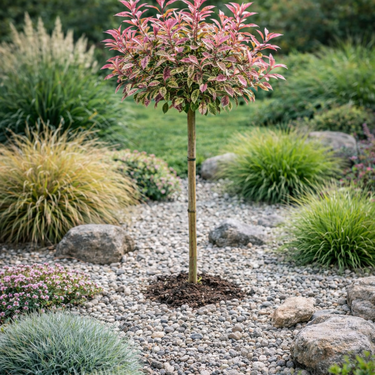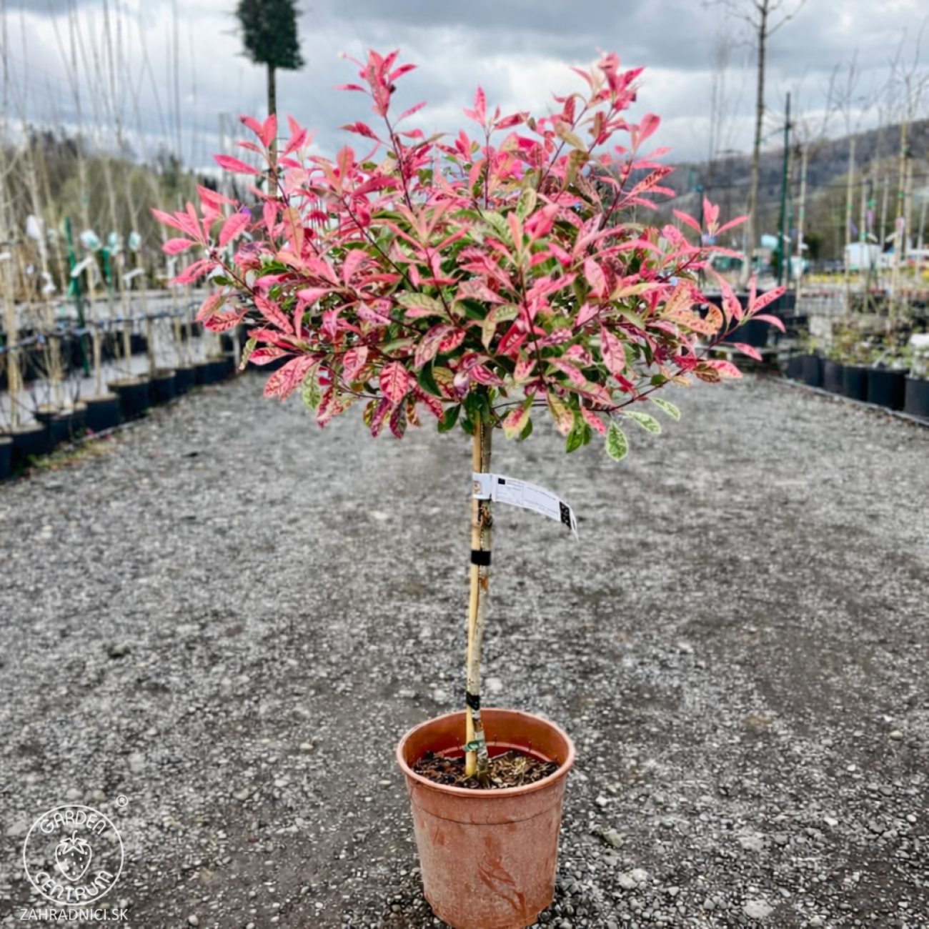 Červienka Fraserova ´PINK MARBLE´ je elegantný stálozelený okrasný ker, ktorý vyniká svojimi farebnými listami a kompaktným, guľovitým tvarom. Je obľúbená pre svoje atraktívne, pestrofarebné listy, ktoré na jar začínajú ružovými odtieňmi, ktoré postupne prechádzajú do krémovo-bielych a zelených tónov. Tento farebný prechod dodáva rastline výrazný kontrast a zaujímavý vzhľad počas celého roka. Photinia fraseri vytvára v záhrade dynamický a pútavý prvok. Kvety sú malé, biele, zhromaždené v hustých kvetenstvách, ktoré kvitnú na jar a majú jemnú vôňu. Po odkvitnutí sa objavujú malé červené bobule, ktoré pridávajú ďalší farebný akcent. Preferuje dobre priepustnú pôdu a slnečné až polotienisté stanovisko. Je pomerne nenáročná na typ pôdy, ale najlepšie rastie v mierne kyslých až neutrálnych pôdach. Vyžaduje pravidelnú zálievku, najmä počas suchších období, ale po zakorenení dokáže tolerovať aj krátkodobé suchá. Tento ker je vynikajúcou voľbou na tvorbu elegantných a farebných živých plotov, ako aj do zmiešaných záhonov. Photinia fraseri na kmienku je vynikajúca voľba pre zmiešané záhony alebo ako solitérna rastlina.