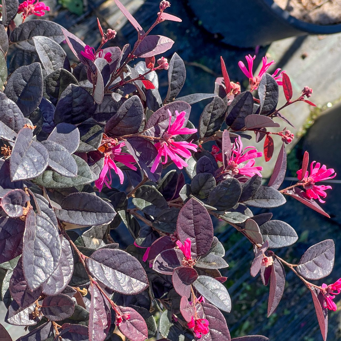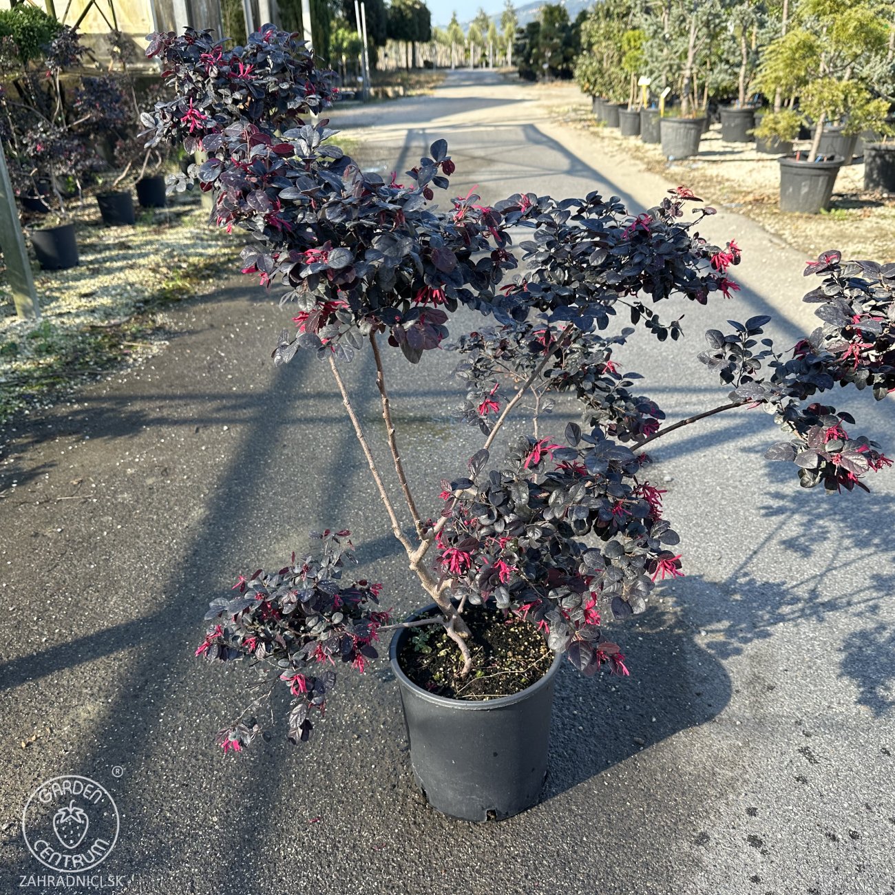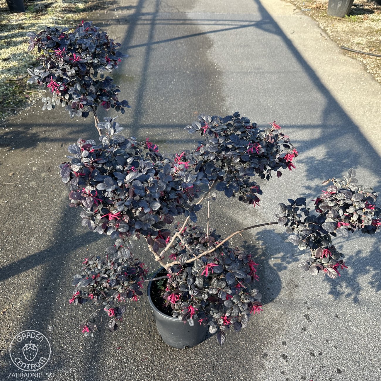 Loropetalum čínske ´BLACK PEARL´ – ponpon je výnimočne dekoratívny okrasný ker tvarovaný do pravidelného guľovitého (ponponového) tvaru, ktorý pôsobí veľmi elegantne a upravene počas celého roka. Vyznačuje sa tmavými, lesklými listami v odtieňoch bordovej až takmer čiernej, ktoré vytvárajú výrazný kontrast s jemnými ružovo-fialovými strapcovitými kvetmi, objavujúcimi sa najmä na jar. Rast má kompaktný a hustý, vďaka čomu si ponponový tvar dlhodobo zachováva svoj dekoratívny vzhľad. Loropetalum Chinense tejto forme je ideálne ako reprezentatívny solitér, do moderných záhrad, formálnych výsadieb, pred vchody do domov alebo na pestovanie v nádobách na terasách a balkónoch. Najlepšie sa mu darí na slnečnom až polotienistom stanovisku, v mierne kyslej, humóznej a dobre priepustnej pôde, pričom slnko podporuje intenzívne vyfarbenie listov. Mrazuvzdornosť dosahuje približne –15 až –18 °C, preto sa v chladnejších oblastiach odporúča zimná ochrana. Loropetalum bonsaj je ideálnou voľbou pre zákazníkov, ktorí hľadajú luxusný, tvarovaný a farebne výrazný prvok do exteriéru.