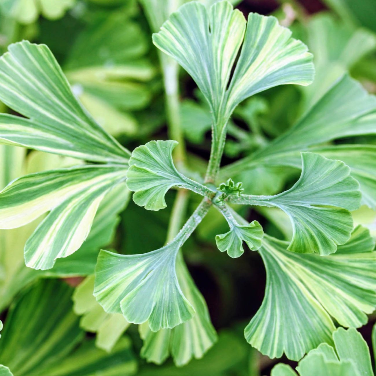 Ginkgo biloba ‘VARIEGATA’ je atraktívny kultivar ginka dvojlaločného, ktorý si získava pozornosť najmä svojím nezvyčajným, pestro sfarbeným olistením. Listy typického vejárovitého tvaru sú nerovnomerne panašované – základná zelená farba je doplnená krémovo bielymi až žltkastými škvrnami a pruhmi, čo stromu dodáva originálny dekoratívny vzhľad. Sfarbenie je najvýraznejšie na mladých listoch na jar a začiatkom leta, no aj počas sezóny zostáva výrazne ozdobné. Na jeseň sa celé olistenie mení na jasne zlatožlté, čím ešte viac vynikne kontrast a strom sa stáva dominantou v záhrade. Rast je spočiatku pomalší, neskôr však strom nadobúda pravidelný, vzpriamený tvar s pevnou korunou.