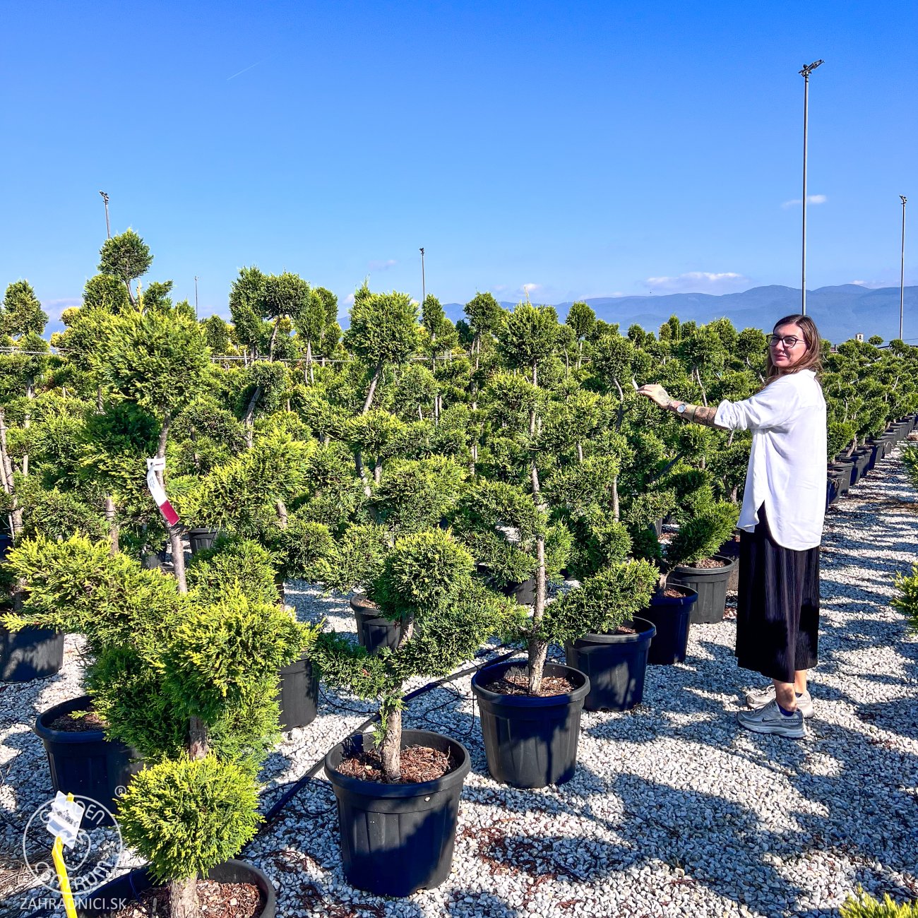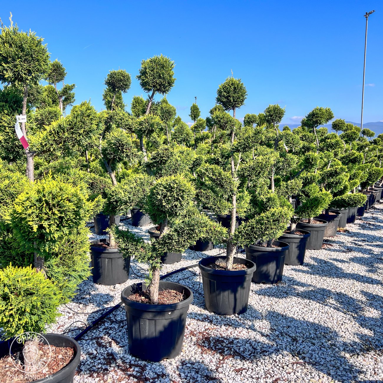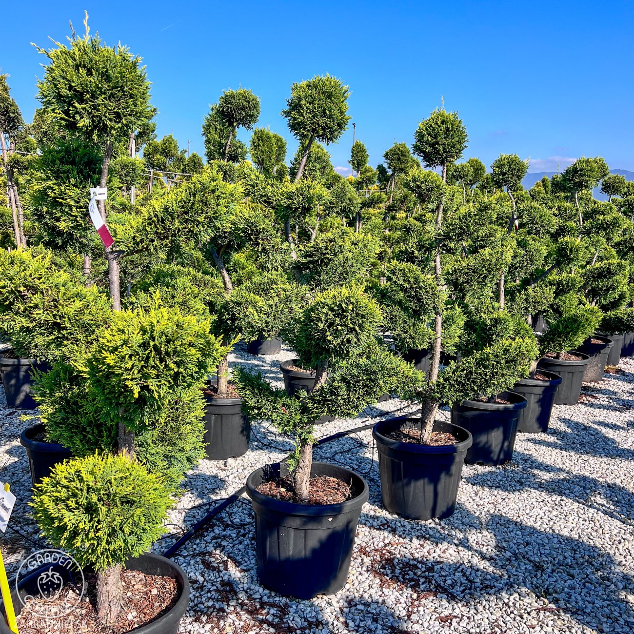 Cyprusovec leylandský ´CASTLEWELLAND GOLD´ - POMPONS je špeciálne tvarovaný ako bonsaj. Môže dosiahnuť výšku približne 3-5 metrov a šírku 1-2 metre. Má pyramídovitý a kompaktný tvar, ktorý zaručuje, že rastlina ostáva úhľadná a nestráca svoju štruktúru. Je známy aj svojimi „pomponmi“ – guľovitými útvarmi na koncoch vetvičiek, ktoré sú zvláštnym rysom tohto kultivaru.