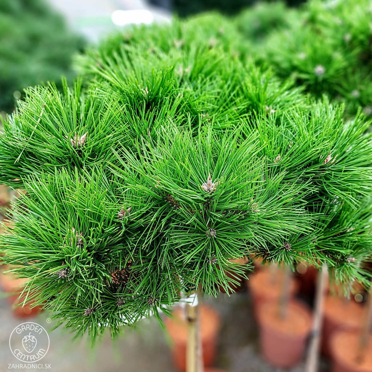 Borovica hustokvetá ´LOW GLOW´ na kmienku je trpasličia odroda s veľmi pomalým, kompaktným rastom. Dorastá približne do výšky 1-3 m a šírky 1-1,5 m, pričom si prirodzene udržiava hustý, guľovitý až plocho guľovitý tvar bez potreby tvarovania. Ihličie je stredne dlhé, jemné, sýtozelené a rastie v pároch, čo rastline dodáva elegantný vzhľad počas celého roka.