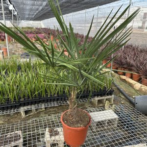 Palma vláknitá – Washingtonia filifera v porovnaní s príbuznou washingtonia robusta je výrazne odolnejšia voči chladu, má pomalší rast a mohutnejší, pevnejší kmeň. Typické sú jej veľké vejárovité listy s charakteristickými vláknami na okrajoch, ktoré jej dodávajú exotický vzhľad. Počas vegetačného obdobia vyžaduje slnečné a teplé stanovište, ideálne chránené pred vetrom, a dobre priepustný substrát, ktorý nezadržiava prebytočnú vlhkosť. Zálievka by mala byť pravidelná, no mierna – palma zle znáša premokrenie koreňov. Washingtonia začína reagovať na chlad pri teplotách okolo –4°C, kedy môže dôjsť k omŕzaniu listov. Samotná rastlina je však pri správnej starostlivosti a ochranách mrazuvzdorná približne do –10°C. V našich podmienkach sa odporúča pestovanie v nádobe s možnosťou zimovania na svetlom, chladnom mieste, alebo dôsledná zimná ochrana pri pestovaní vonku (ochrana srdca palmy, zviazanie listov a prekrytie). Palma vláknitá je ideálnou voľbou pre milovníkov exotiky, ktorí hľadajú odolnejšiu palmu s výrazným vzhľadom, vhodnú na terasy, zimné záhrady či chránené záhradné stanovištia.
