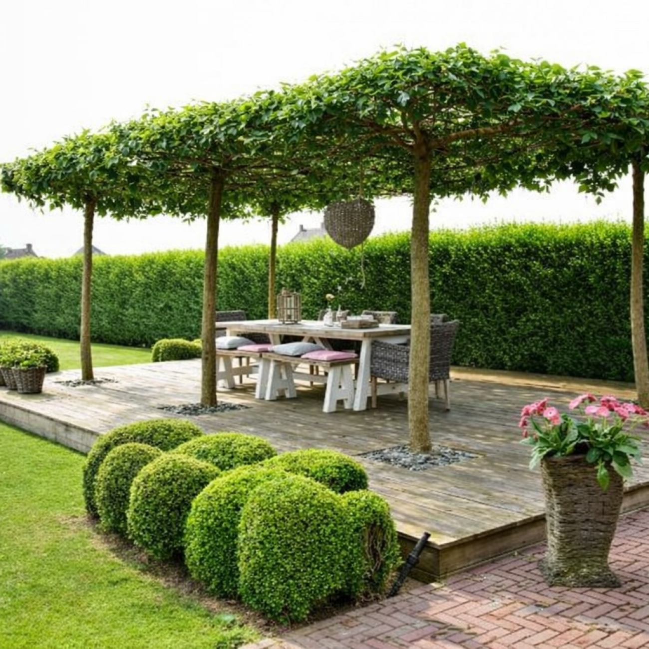 Nechajte sa inšpirovať podobne rastúcimi listnatými tvarovanými drevinami ako sú napríklad Platany, Hraby, Vistérie, ktoré sa dajú tvarovať do podobného tvaru strechy.