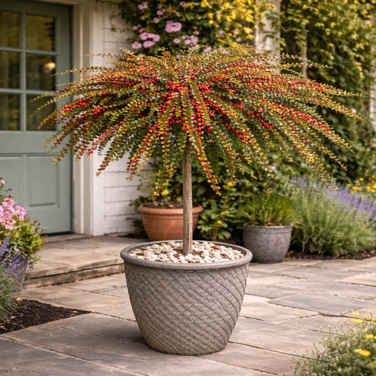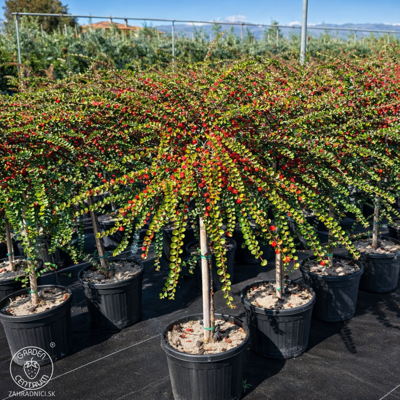 Skalník rozprestretý na kmienku je dekoratívna tvarovaná forma tejto obľúbenej dreviny, ktorá spája elegantný vzhľad stromčeka s typickým rozložitým, previsnutým rastom koruny. Vďaka vrúbľovaniu na kmienok vytvára malý stromček s dáždnikovitou alebo mierne previsnutou korunou, ktorý pôsobí veľmi esteticky a moderne. Na jar kvitne drobnými bielo-ružovými kvetmi, po ktorých sa tvoria jasne červené plody, pretrvávajúce často až do zimy. Listy sú malé, lesklé, tmavozelené a na jeseň sa výrazne sfarbujú do oranžových a červených tónov, čo zvyšuje jeho celoročnú okrasnú hodnotu.