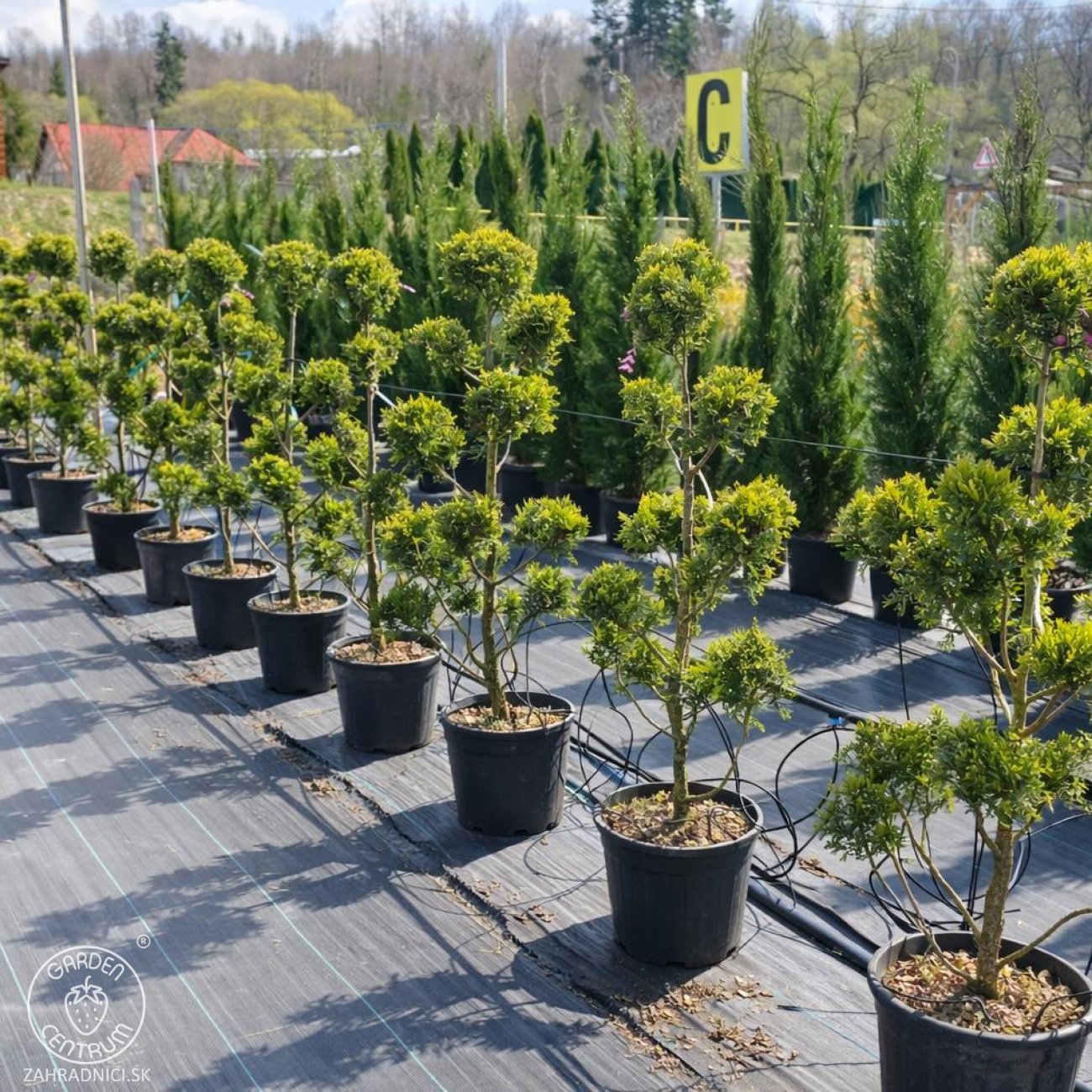 Cyprusovec leylandský ´CASTLEWELLAND GOLD´ je rýchlo rastúci okrasný ihličnan. Je to zlato-žltá verzia cyprusovca leylandského. Pôvodom je tento strom široký a kužeľovitý. Tento ihličnan je výnimočný najmä vďaka svojmu zaujímavému sfarbeniu, ktoré si drží počas celého roka. Strom v dospelosti dorastá do výšky 8-10 metrov s ročným prírastkom 30-40 cm, výška však samozrejme záleží od strihania. Cupressocyparis leylandii rastie v takmer každej dobre priepustnej pôde, kde bude mať dostatok miesta pre korene. Ideálne je slnečné stanovisko prípadne polotieň. Je odolný voči chorobám a škodcom. Cyprusovec leylandský ´CASTLEWELLAND GOLD´ - POMPONS je špeciálne tvarovaný ako bonsaj. Môže dosiahnuť výšku približne 3-5 metrov a šírku 1-2 metre. Má pyramídovitý a kompaktný tvar, ktorý zaručuje, že rastlina ostáva úhľadná a nestráca svoju štruktúru. Je známy aj svojimi „pomponmi“ – guľovitými útvarmi na koncoch vetvičiek, ktoré sú zvláštnym rysom tohto kultivaru.