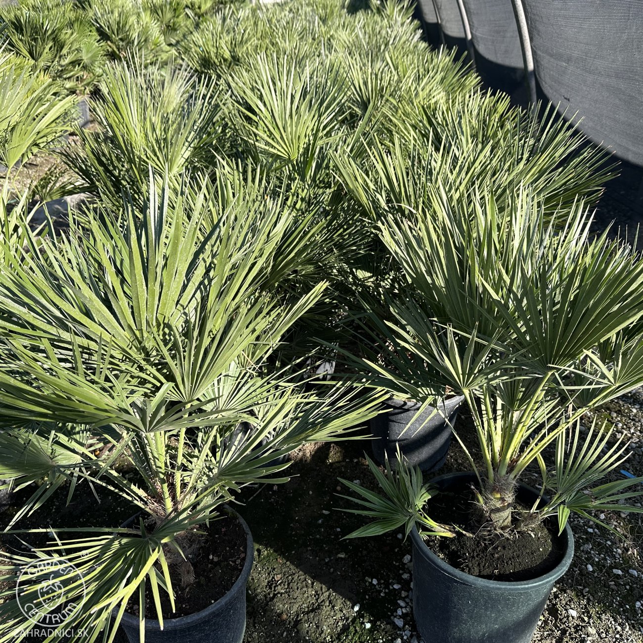 Chamaerops humilis je nazývaná aj ako ´trpasličia´ palma. Táto palma je jediná, pôvodom európska. V hojných počtoch ju môžeme vidieť rásť po celom stredomorí, kde je veľmi obľúbená najmä pre svoj krásny exotický vzhľad, veľkú suchomilnosť a nenáročnosť pri pestovaní. Má vejárovité, modrozelené listy. Táto palma kvitne v prvých rokoch života a vytvára veľké žlté súkvetia, neskôr oranžové plody. Palma je mrazuvzdorná do -14°C. Najväčším predpokladom na bezproblémové prezimovanie je kvalitný zimný zábal a spoľahlivé vetranie počas zimy v teplejších dňoch. Z vlastných skúsenosti vieme, že palme neuškodí tak veľmi silný mráz, ako nadmerná vlhkosť počas zimy a mrazivých dní. Pri zanedbanom vetraní rastlina často začína hniť. Tento druh palmy je známy pomalším rastom a rastie prevažne do šírky ako do výšky. Počas rastu vytvára viacero kmeňov a tým neskôr vzniká efektný exotický krík, alebo skupina niekoľkých paliem. Palmy je možné aj deliť a pestovať osobitne, avšak je to zložitejšie a treba dávať veľký pozor na zachovanie a nepoškodenie koreňov odnoží.