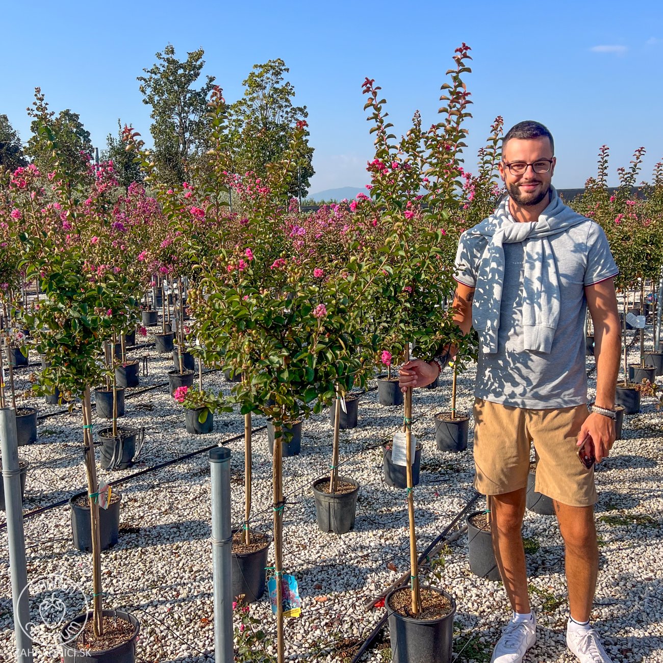 Myrta krepová 'Violacea' je elegantný okrasný ker alebo menší strom, ktorý očarí svojím bohatým letným kvitnutím. Táto odroda vyniká nádhernými ružovými kvetmi usporiadanými do hustých metlín, ktoré rozkvitajú od leta až do jesene, čím prinášajú do záhrady dlhodobú farebnú nádheru. Listy sú tmavozelené, lesklé a na jeseň sa menia na odtiene žltej, oranžovej až červenej, čím dodávajú rastline ďalší dekoratívny efekt. Kôra myrty krepovej je hladká a olupuje sa v tenkých vrstvách, čo vytvára zaujímavú textúru.