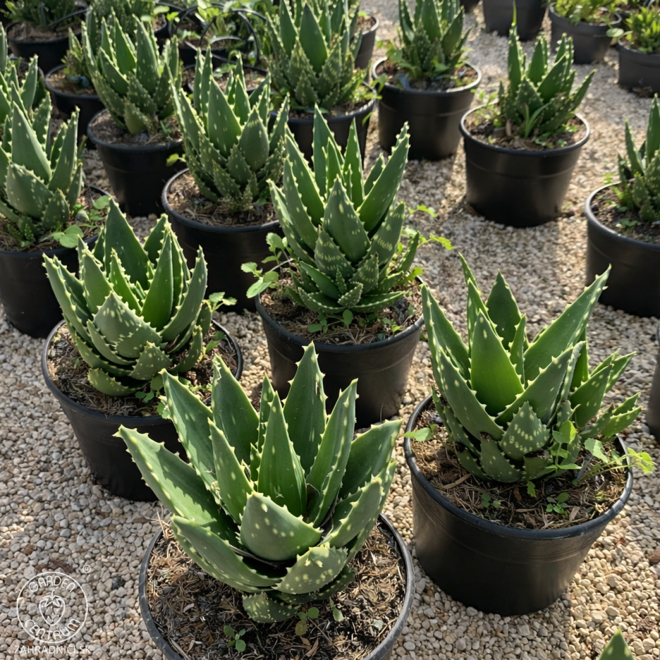 Aloe mitriformis je atraktívna druhová aloe s pevnými, mäsitými listami usporiadanými do kompaktných ružíc. Listy sú sýtozelené s jemnými svetlými bodkami a drobnými zúbkami na okrajoch, vďaka čomu pôsobí rastlina výrazne dekoratívne a moderne.
