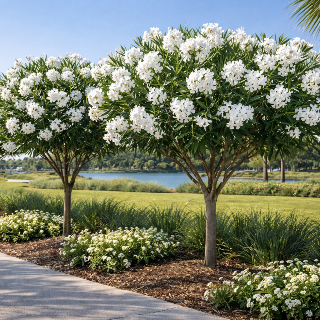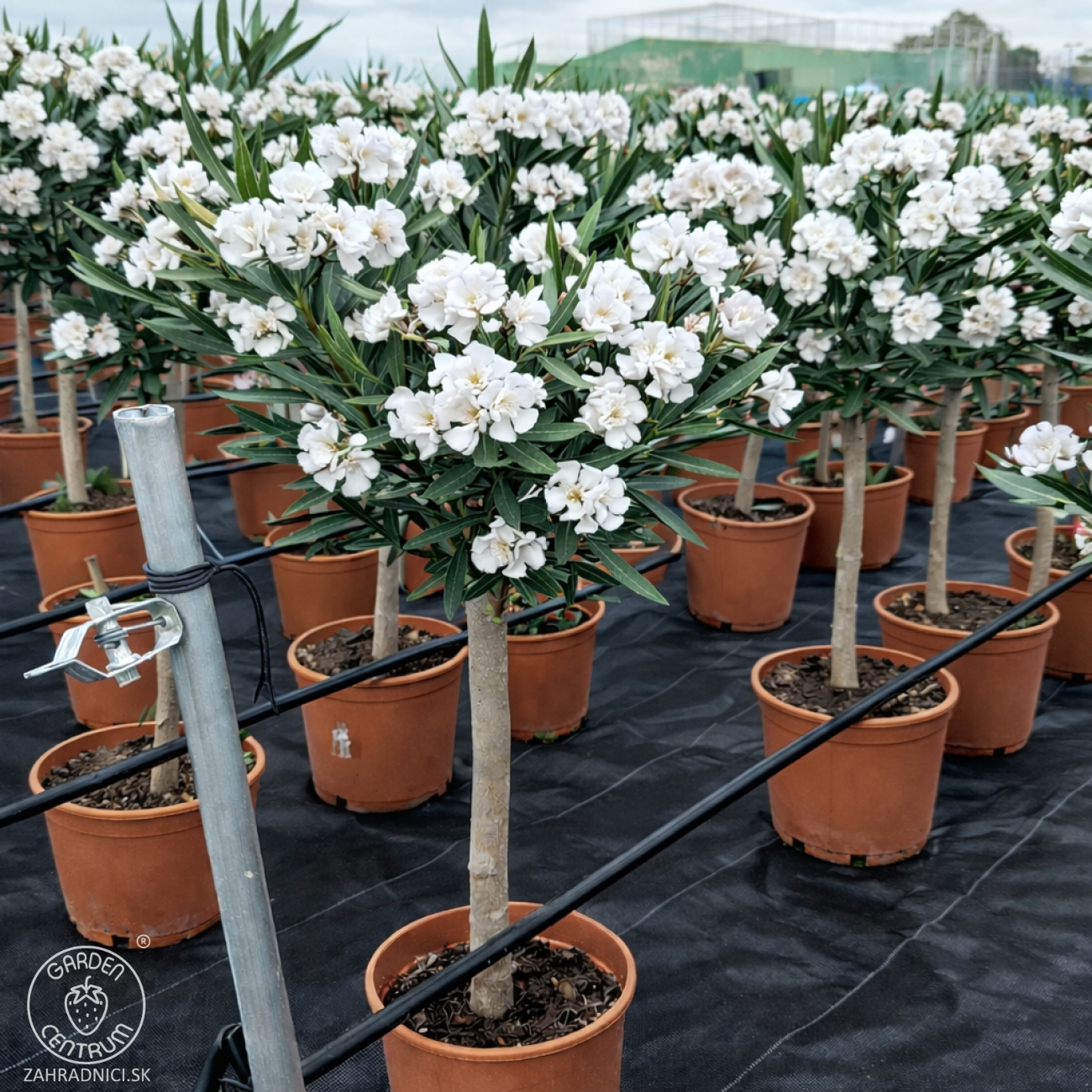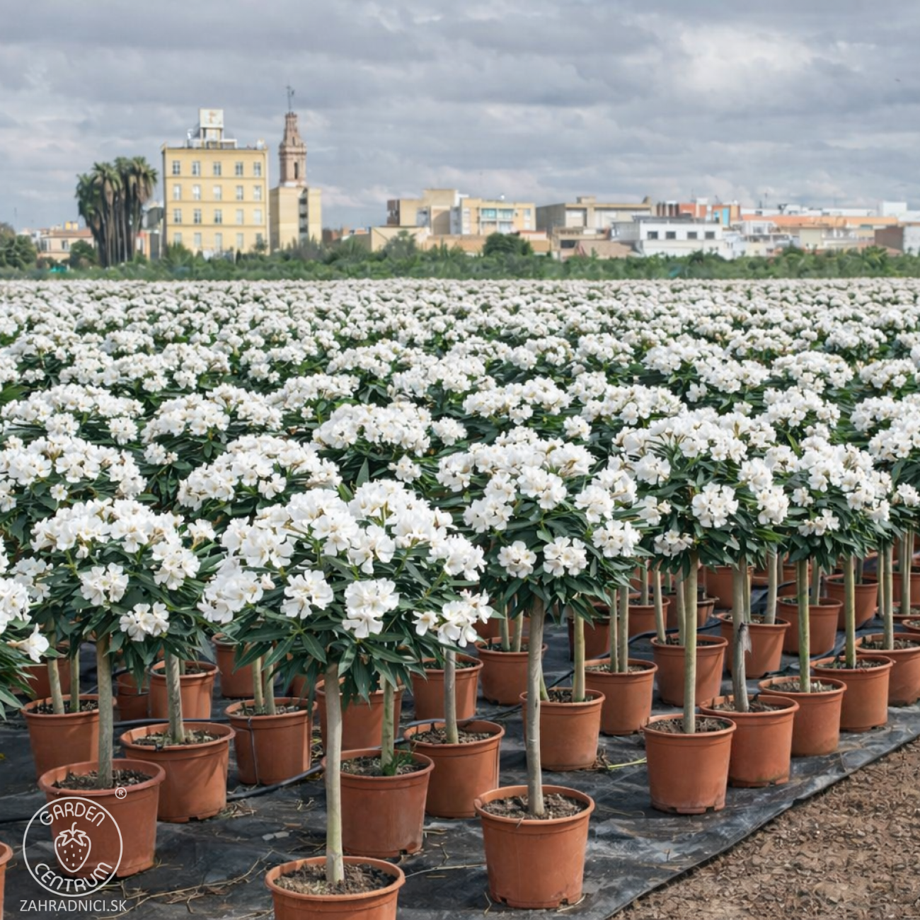 Oleander biely Mont Blanc na kmienku pôsobí ako živá socha – nie je len kvitnúcou rastlinou, ale plnohodnotným dizajnovým prvkom, ktorý dokáže nahradiť dekorácie, kvetináče či sezónne výsadby trvalým a reprezentatívnym riešením.