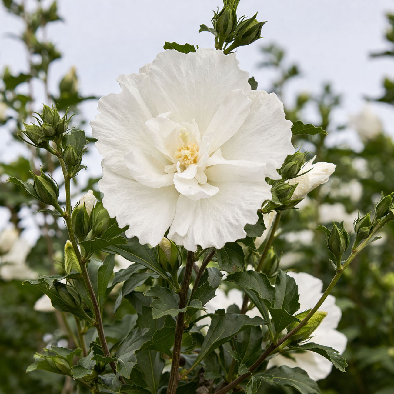Ibištek sýrsky ‘Gandini van Aart’, známy ako Flower Tower White, je moderná odroda s úzkym, vzpriameným rastom. Vďaka svojmu kompaktnému tvaru je ideálny do menších záhrad, k plotom či do úzkych záhonov, kde vytvorí výrazný, no zároveň elegantný prvok.
