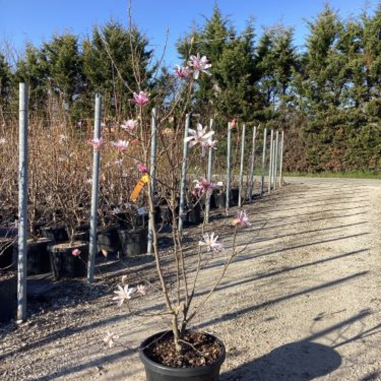 Magnólia 'LEONARD MESSEL' je nádherný, pomaly rastúci ružový ker alebo menší strom, ktorý dorastá do výšky 400-600 cm. Jeho listy sú oválne, kožovité a majú sviežu zelenú farbu, ktorá dokonale kontrastuje s jemnými kvetmi. Nežné kvety sú hviezdicovitého tvaru, s jemne ružovými okvetnými lístkami, ktoré prechádzajú do bielych tónov smerom do stredu. Táto magnólia kvitne na jar, zvyčajne v apríli, ešte predtým, než sa rozvinú listy, a ponúka tak krásne a vonné kvitnutie, ktoré trvá približne 2-3 týždne. Magnólia vyžaduje mierne kyslú, mierne vlhkú a dobre priepustnú pôdu. Najlepšie sa jej darí na slnečnom až polotienistom stanovišti, ktoré je chránené pred silným vetrom. Táto odroda je mrazuvzdorná až do -24 °C, čo ju robí vhodnou na pestovanie aj v miernych klimatických podmienkach. Magnólia´LEONARD MESSEL´ je ideálna ako solitér alebo do skupinových výsadieb, kde upúta svojím krásnym kvitnutím a jemnou vôňou.